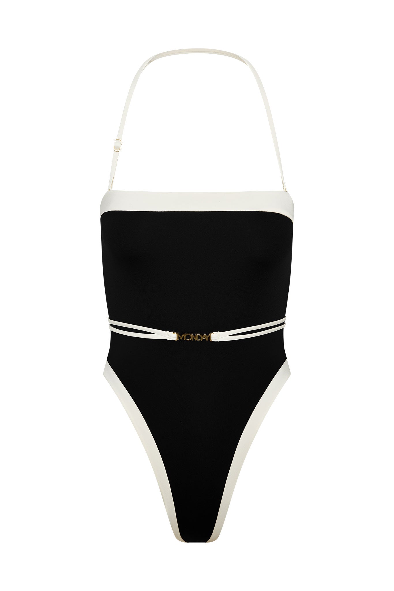 Dive into sophistication with our Miami One Piece. Featuring removable straps and a gold Monday logo removable belt for versatile flair, the strapless silhouette and cheeky coverage exude confidence, making it the perfect choice for a chic look on and off the sand.